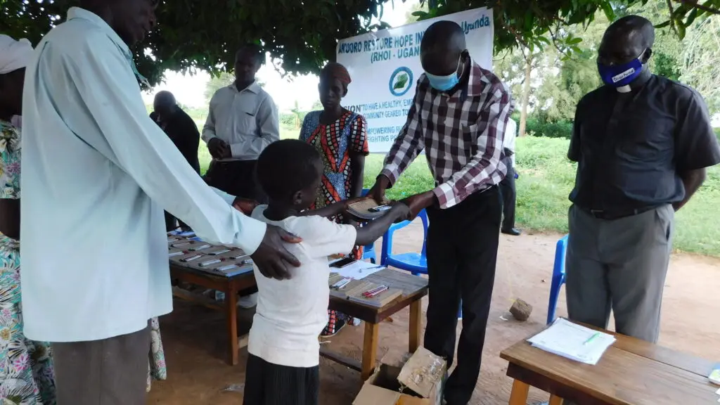 Smiling faces of RHOI-Uganda staff and sponsored students reflect the joy of opportunity. Our sponsorship covers tuition, uniforms, books, and psychosocial support.