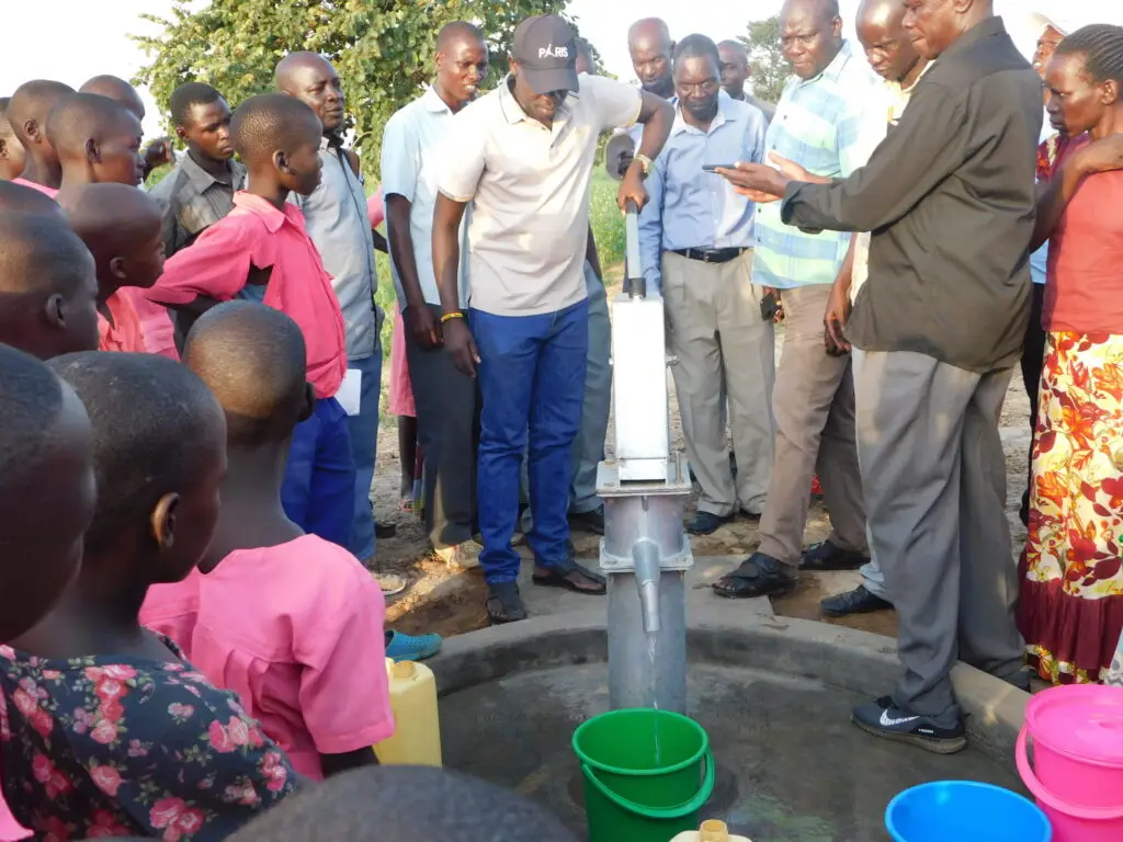 This photo captures the handover of the Angole Primary School borehole to Serere District authorities. The project ensures clean water access to both students and the surrounding community, enhancing health and learning outcomes.